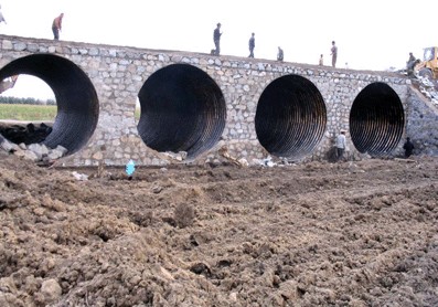 e)如果涵長大于30米,波紋管兩側(cè)與原涵寬度小于80cm,可將3m-6m長涵管在下游或上游向一端推進(jìn),就位以后,可以將其固定,砌筑頂端的片石端墻,波紋管的另一端與涵洞間的間距用沙袋或漿砌片石擋住,寬度50cm,然后開始回填。兩側(cè)可用粗沙水密法密實或澆注混凝土震動棒搗實;頂部采用高壓泵送膨脹水泥沙漿。該節(jié)管四周填筑完畢以后,將第二節(jié)管運至,進(jìn)行兩管的連接,波紋管的連接方式為內(nèi)法蘭螺栓連接,工人可在管內(nèi)連接。連接完畢后,以上述相同的方法進(jìn)行回填。依此順序,完成整道涵管的修建工作。
