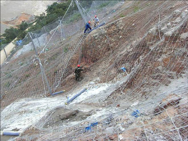 柔性防護(hù)網(wǎng):作用原理上類似于噴錨和土釘墻等面層護(hù)坡體系,但因其柔性特征能使系統(tǒng)將局部集中荷載向四周均材質(zhì):鋼絲繩網(wǎng)、普通鋼絲格柵(常稱鐵絲格柵)和TECCO高強(qiáng)度鋼絲格柵 勻傳遞以充分發(fā)揮整個(gè)系統(tǒng)的防護(hù)能力,即局部受載,整體作用,從而使系統(tǒng)能承受較大的荷載并降低單根錨桿的錨固力要求 。具有高柔性,高防護(hù)強(qiáng)度,易鋪展性。適應(yīng)任何坡面地形,安裝程序標(biāo)準(zhǔn)化、系統(tǒng)化。系統(tǒng)采用模切化安裝方式,工期短,施工費(fèi)用低。系統(tǒng)材料的特殊制造工藝和高防腐防銹技術(shù),決定了系統(tǒng)的超高壽命。系統(tǒng)能將工程隊(duì)環(huán)境的影響降到最低點(diǎn),其防護(hù)區(qū)域可以充分的保護(hù)土體、巖石的穩(wěn)固,便于人工綠化,有利于環(huán)保。