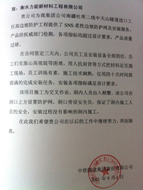 貴公司為我集團(tuán)公司南疆吐庫(kù)二線中天隧道進(jìn)口工區(qū)高邊坡防護(hù)工程提供了SNS柔性防護(hù)網(wǎng)及安裝服務(wù),產(chǎn)品經(jīng)權(quán)威部門(mén)檢測(cè),各項(xiàng)指標(biāo)均超過(guò)設(shè)計(jì)要求,廠品質(zhì)量過(guò)硬。