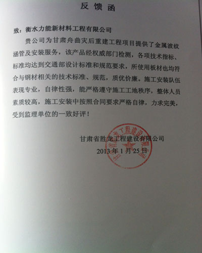 衡水力能新材料工程有限公司主要生產(chǎn)波紋涵管、鍍鋅波紋管涵、隧道加固波紋板等產(chǎn)品,公司創(chuàng)立于2008年,公司位于衡水市濱湖新區(qū)開發(fā)區(qū)。公司現(xiàn)注冊資金一億零五百萬元,年設(shè)計生產(chǎn)能力達(dá)2.5億元,成為國內(nèi)規(guī)模較大的波紋涵管,防護(hù)網(wǎng)生產(chǎn)企業(yè)。 公司自創(chuàng)建以來就堅持人為本、夯實質(zhì)量、持續(xù)發(fā)展、顧客滿意”的質(zhì)量方針,建立了科學(xué)完善的質(zhì)量管理與保證體系,F(xiàn)已形成以鋼波...