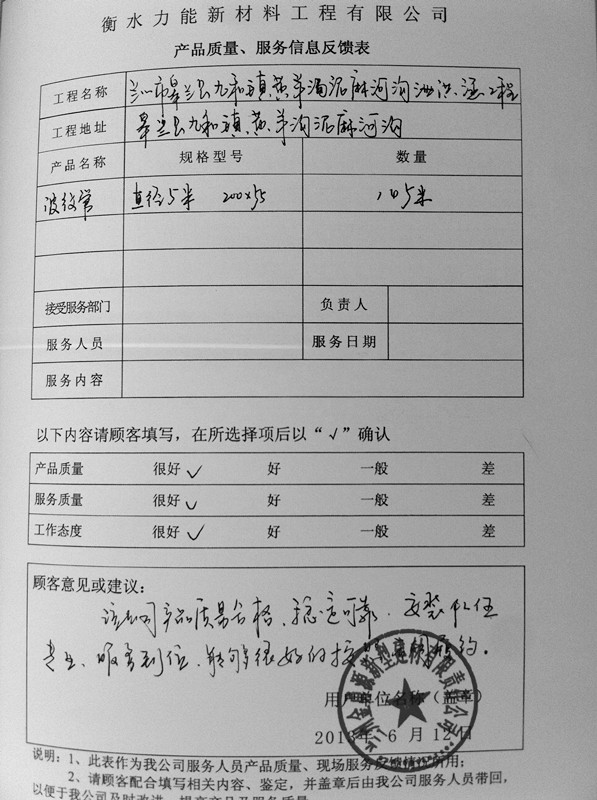 蘭州市對(duì)衡水力能波紋涵管產(chǎn)品質(zhì)量和服務(wù)信息的反饋意見(jiàn)或建議: