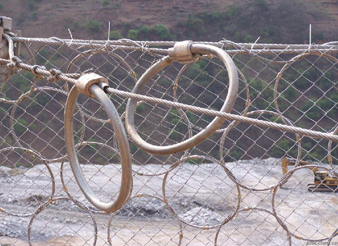 被動(dòng)環(huán)形邊坡柔性防護(hù)網(wǎng)是由鋼絲繩網(wǎng)、環(huán)形網(wǎng)、(需攔截小塊落石時(shí)附加一層鐵絲格柵)、固定系統(tǒng)(錨桿、拉錨繩、基座和支撐繩)減壓環(huán)和鋼柱四個(gè)主要部分構(gòu)成。鋼柱和鋼絲繩網(wǎng)連接組合構(gòu)成一個(gè)整體,對(duì)所防護(hù)的區(qū)域形成面防護(hù),從而阻止崩塌巖石土體的下墜,起到邊坡防護(hù)作用。