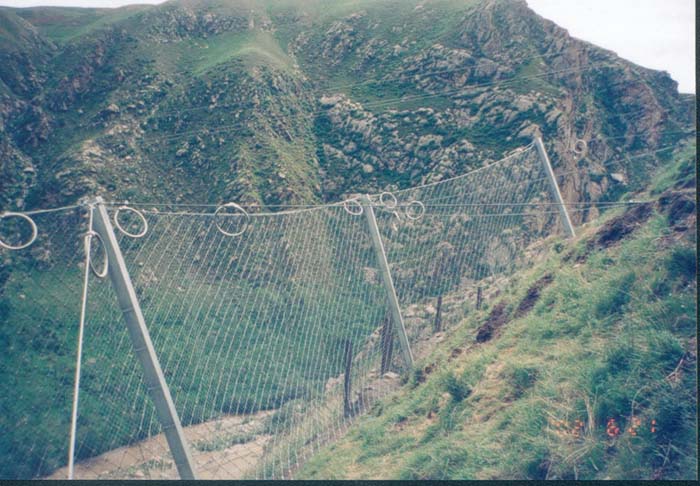 適用于建筑設(shè)施旁有緩沖地帶的高山峻嶺,把巖崩、飛石、雪崩、泥石流攔截在建筑設(shè)施之外,避開災(zāi)害對建筑設(shè)施的毀壞 的常用規(guī)格:[鋼柱(間距10M),帶消能環(huán)的∮16雙支撐繩和∮16“人”字形上拉錨繩(每跨6個消能環(huán)),∮16側(cè)拉錨繩(單繩),◇/08/200/4*5㎡鋼絲繩網(wǎng),∮8縫合繩,格柵網(wǎng)]